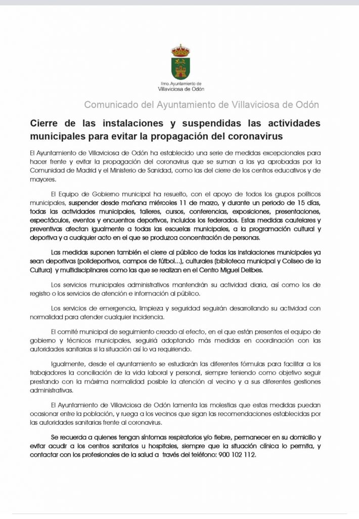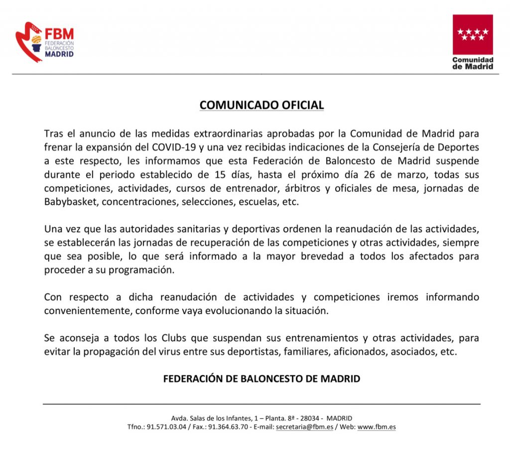 En base a los últimos acontecimientos relativos al coronavirus ABVO SUSPENDE los entrenamientos y todas las actividades hasta nuevo aviso. En archivos adjuntos os remitimos comunicado del Ayuntamiento de Villaviciosa de Odón así como comunicado de la Federación Madrileña de Baloncesto. La actividad administrativa de la Agrupación sigue su curso normal y en el día de mañana recibiréis un correo masivo con los comunicados oficiales. En cuanto al Torneo de Semana Santa os mantendremos debidamente informados. Un saludo